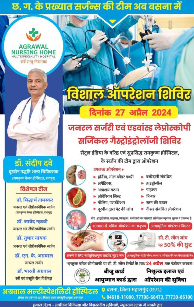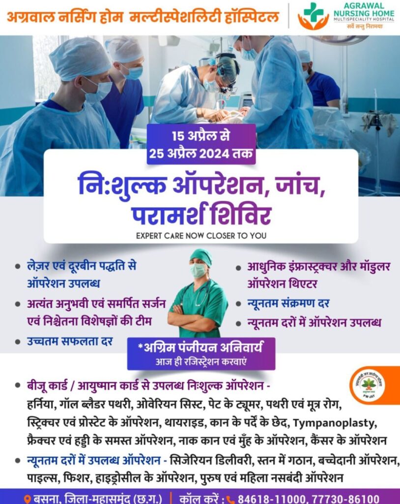 इस तरह से अग्रवाल नर्सिंग होम बसना अपनी उदारता व सेवा भावी सोच का परिचय देते हुए, अंचल के जरूरतमंद बीमार लोगों के लिए संजीवनी केन्द्र बनते जा रहा है।डाॅ.अमित अग्रवाल ने बताया कि,अस्पताल प्रबंधन ने बच्चों के आपरेशन शिविर के दौरान मरीजों एवं उनके परिजनों का रूकना, खाना, दवाइयां जांच ऑपरेशन पूरी तरह कैशलेस अर्थात निःशुल्क था। उन्होंने बताया कि इस तरह के विशाल शिविर का आयोजन निरंतर होते जा रहा है, जिससे सभी तबके के मरीजों को स्वास्थ्य लाभ मिल रहा है। इस कड़ी को और आगे बढ़ाते हुए आगामी 24 अप्रैल को हड्डी रोग से संबंधित व 27 अप्रैल को प्रख्यात लेप्रोस्कोपिक सर्जन डाॅ.संदीप दवे एवं पाँच डाक्टरों की टीम द्वारा मेजर आपरेशन शिविर का आयोजन रखा गया है।