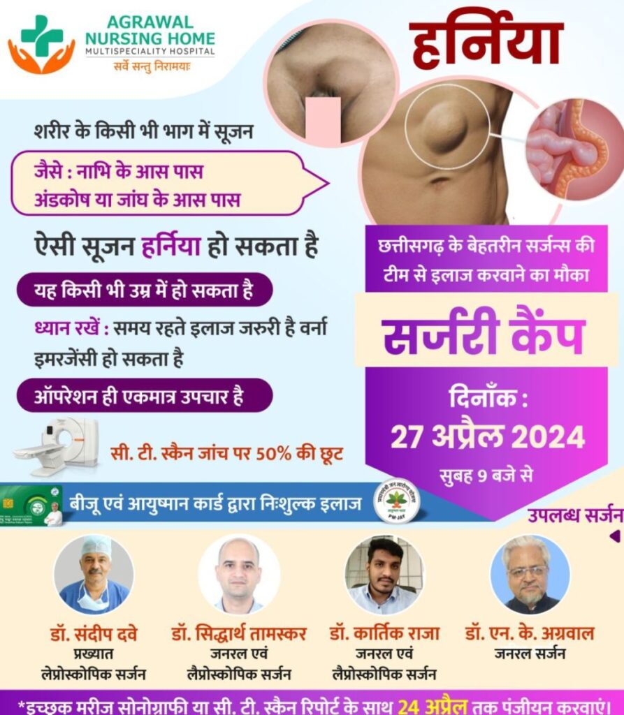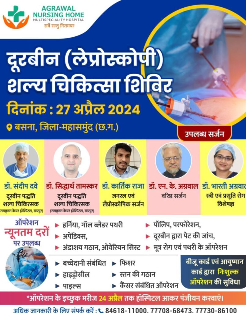 हड्डी रोग जांच परामर्श एवं ऑपरेशन शिविर (आर्थो कैंप)24 अप्रैल को अग्रवाल नर्सिंग होम बसना में ।