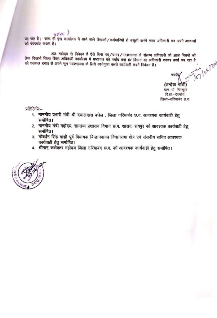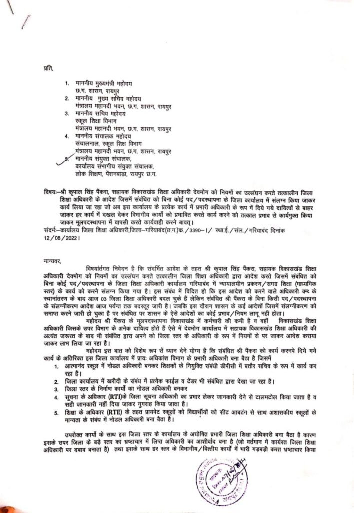 गरियाबंद जिला शिक्षा विभाग द्वारा प्रशासन के आदेशों की जा रही है अवहेलना। आदेश होने के बाद भी जिला शिक्षा अधिकारी गरियाबंद द्वारा संलग्नीकरण समाप्ति जैसे आदेशो का नही किया जा रहा है पालन।