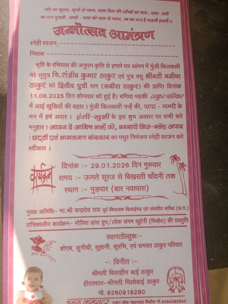 Post: कांग्रेस के समर्पित नेता संजीव ठाकुर के घर छट्ठी कार्यक्रम में बिलाईगढ पूर्व विधायक चंद्रदेव राय शामिल हुए।