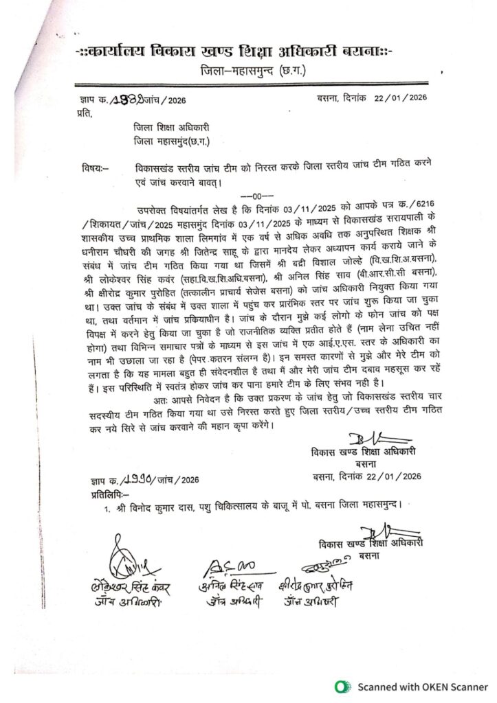 बताना जरूरी है कि हेमंत रमेश नंदनवार आइएएस तात्कालीन एसडीएम सरायपाली ने 11 अगस्त 2023 को शासकीय मिडिल स्कूल लिमगांव का औचक निरीक्षण किया। जांच में पाया कि वहां के धनीराम चौधरी प्रधानपाठक लकवाग्रस्त एक वर्ष से अनुपस्थित है। उसकी जगह में बाहरी युवक जितेन्द्र साहू को 6500 रूपये मासिक मानदेय पर अध्यापन करवाने रखा था। जिसका पंचनामा एवं बयान हुआ। जिसमें बीईओ कार्यालय सरायपाली के दो एबीइओ डी.एन दीवान एवं जितेन्द्र रावल का भी दस्तखत है।