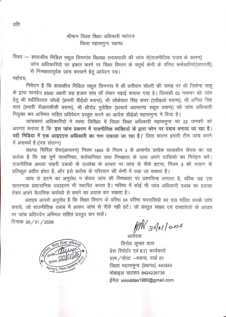 सरायपाली। महासमुन्द जिला अन्तर्गत सरायपाली ब्लाक के शासकीय मिडिल स्कूल लिमगांव की जांच प्रकरण सुर्खियो में है। अब शिक्षा विभाग के 04 वरिष्ठ चपरासियो से जांच की मांग शिकायतकर्ता विनोद कुमार दास ने विजय लहरे डीईओ महासमुन्द से की है। जांच अधिकारियो का जांच से पीछे हटना और जिला शिक्षा अधिकारी का चिटठी-चिटठी खेल किये जाने से विभाग की कलई खोल दी है। सूत्रो ने बताया कि ऐसे दर्जनो मामले है। जिनमें अधिकारी का वरहस्त है, निजी स्वार्थ है। इसी कारण ये ‘मंथली स्कीम ‘ चल रहा है।